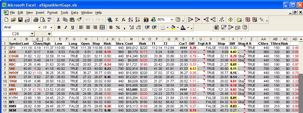 | TC2000, Excel and eSignal: Create a list of potential trades for day trading. Screenshot. | |