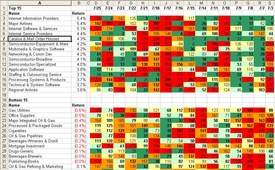 | Excel, FrontPage and TC2000: Daily sector analysis over several time periods and post to web. Screenshot. | |